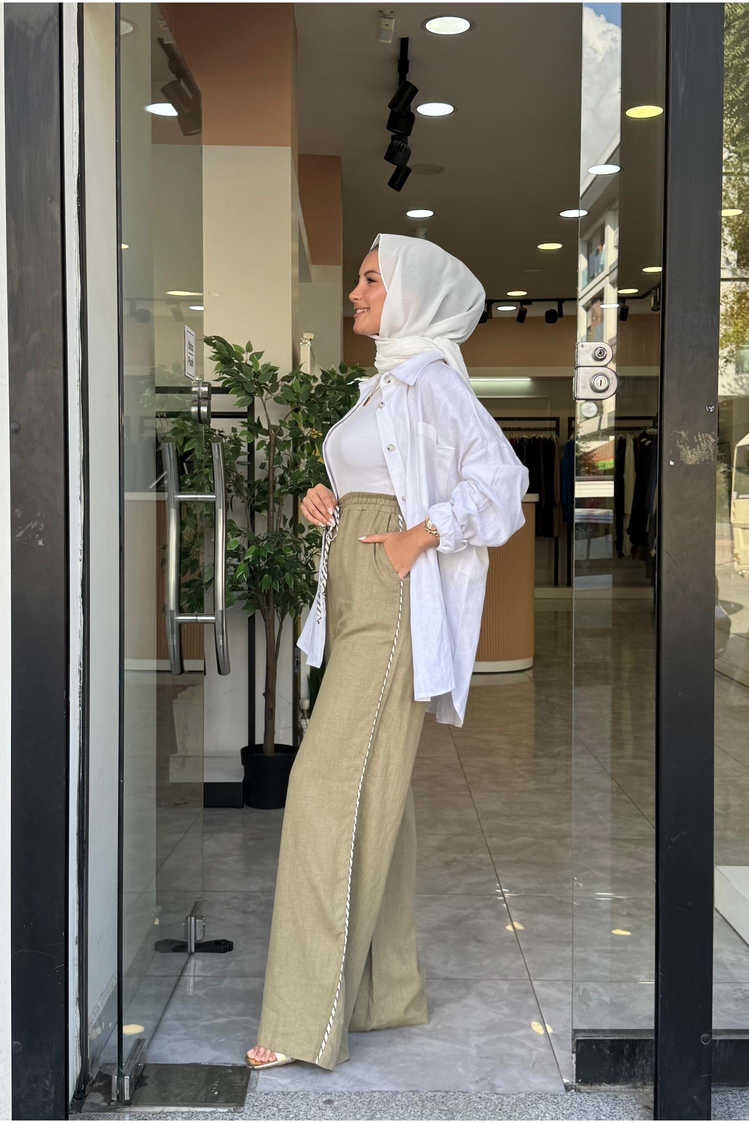 BİYE KETEN PANTOLON - YEŞİL - S