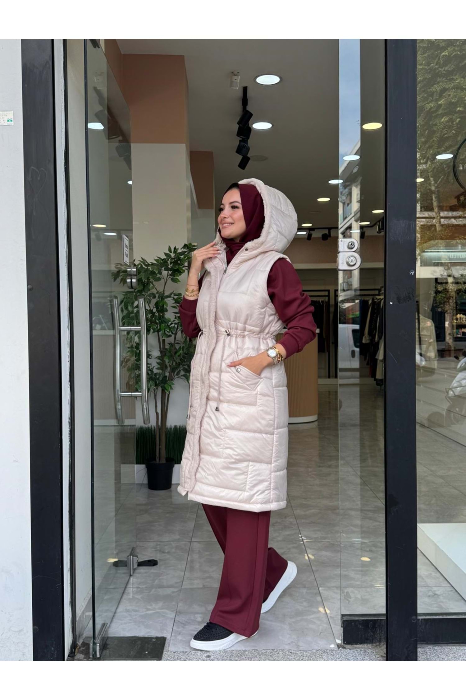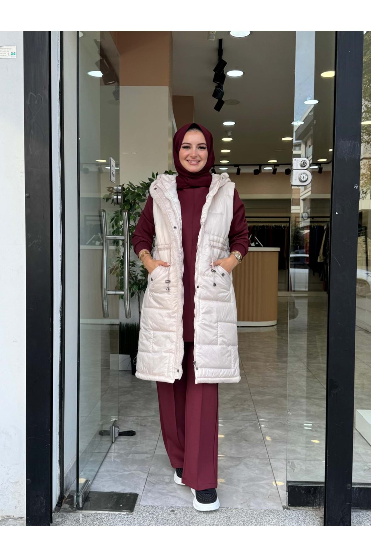 KOPÜŞONLU ARA BOY ŞİŞME YELEK - KREM - 38