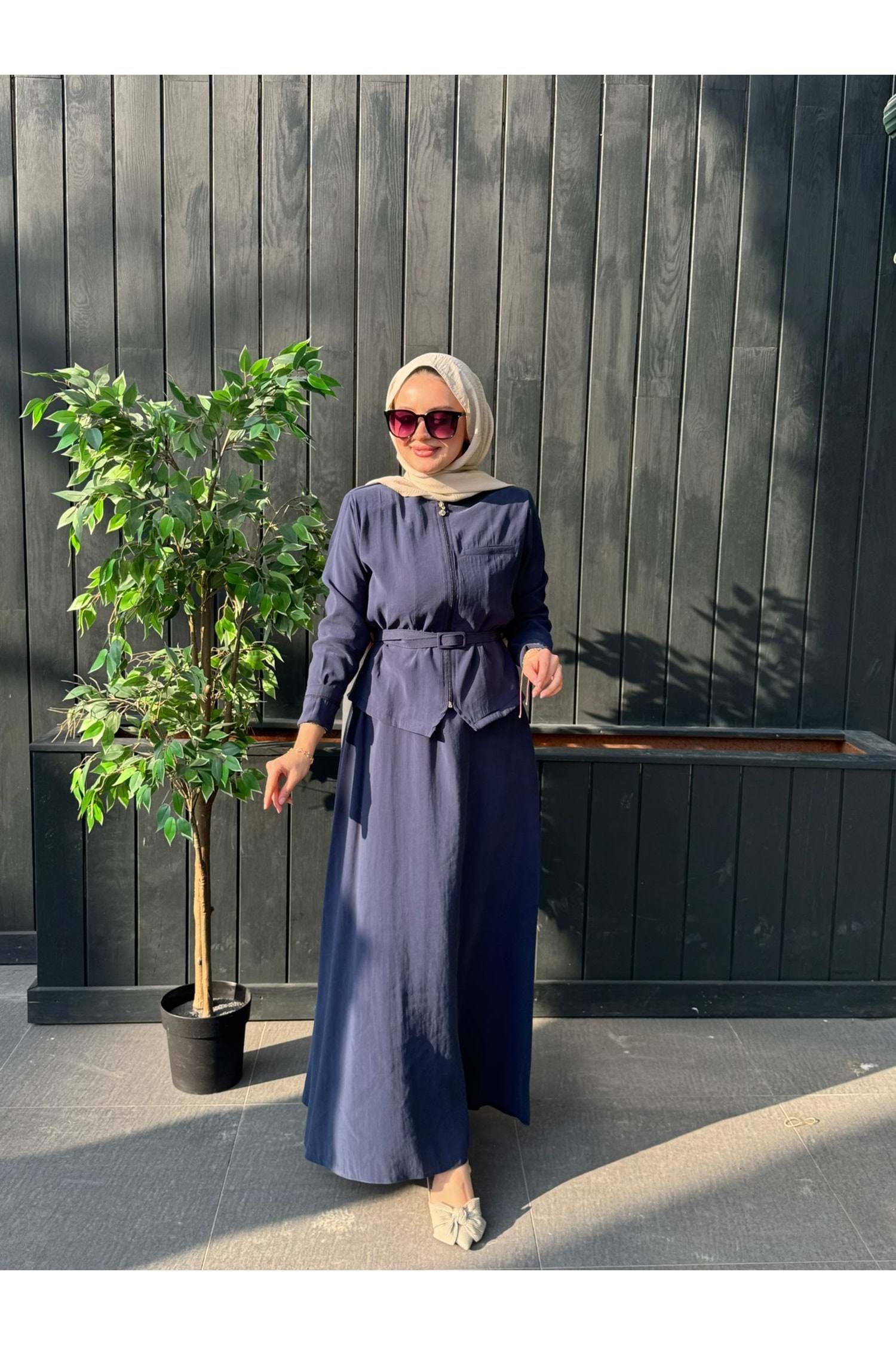 MODAL CUPRA KEMERLİ ELBİSE - LACİVERT - XL