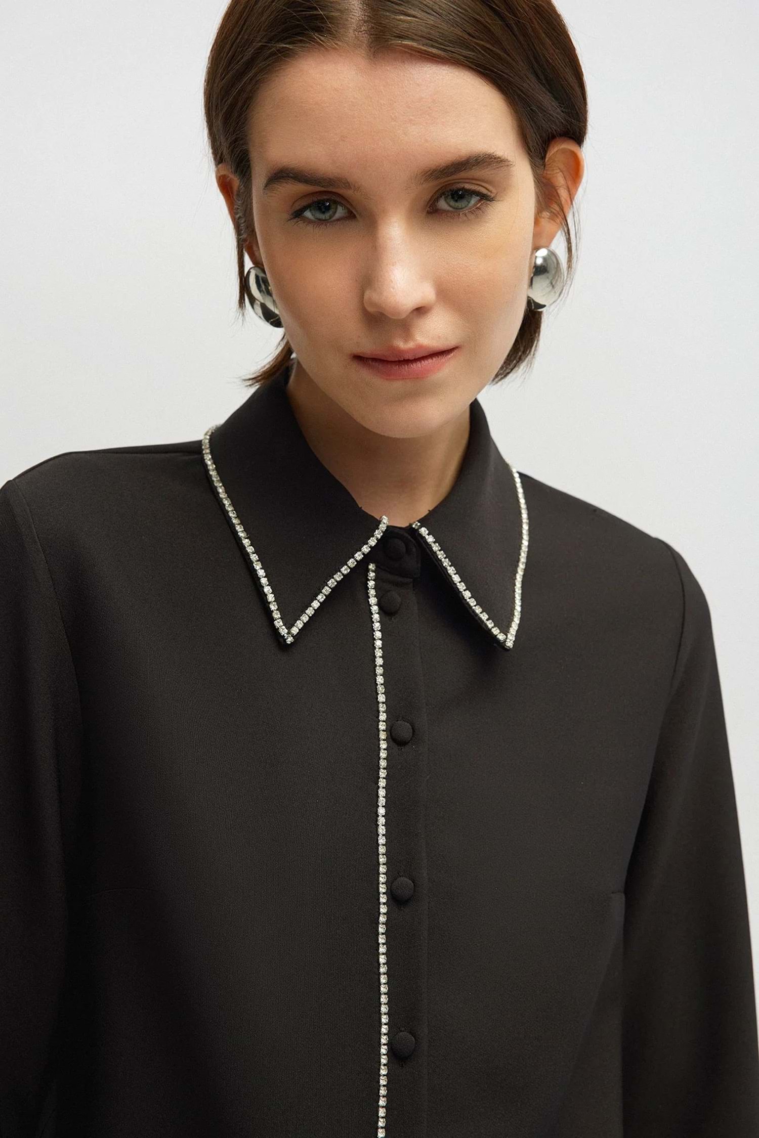 PARLAK TAŞLI KREP GÖMLEK - SİYAH - 36