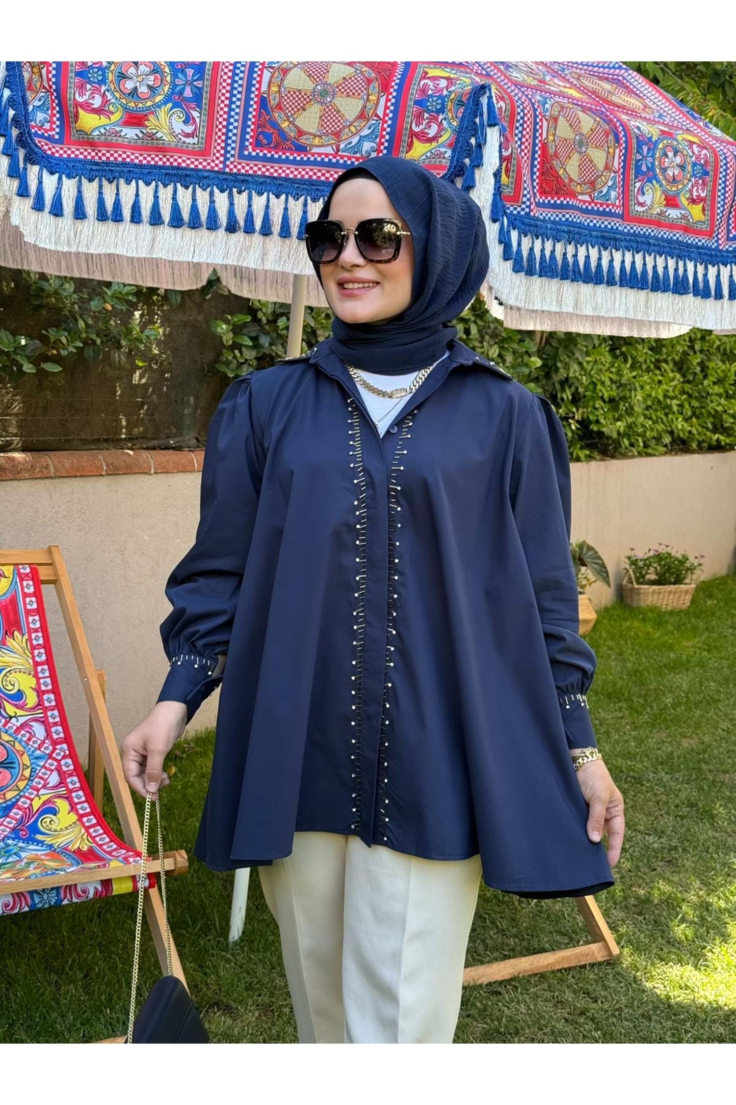 Ön kısmında yer alan boncuk süslemeleri tamamen el işçiliği ile yapılmıştır. Her bir detay titizlikle hazırlanmış olup gömleğe zarif ve özgün bir görünüm kazandırır.